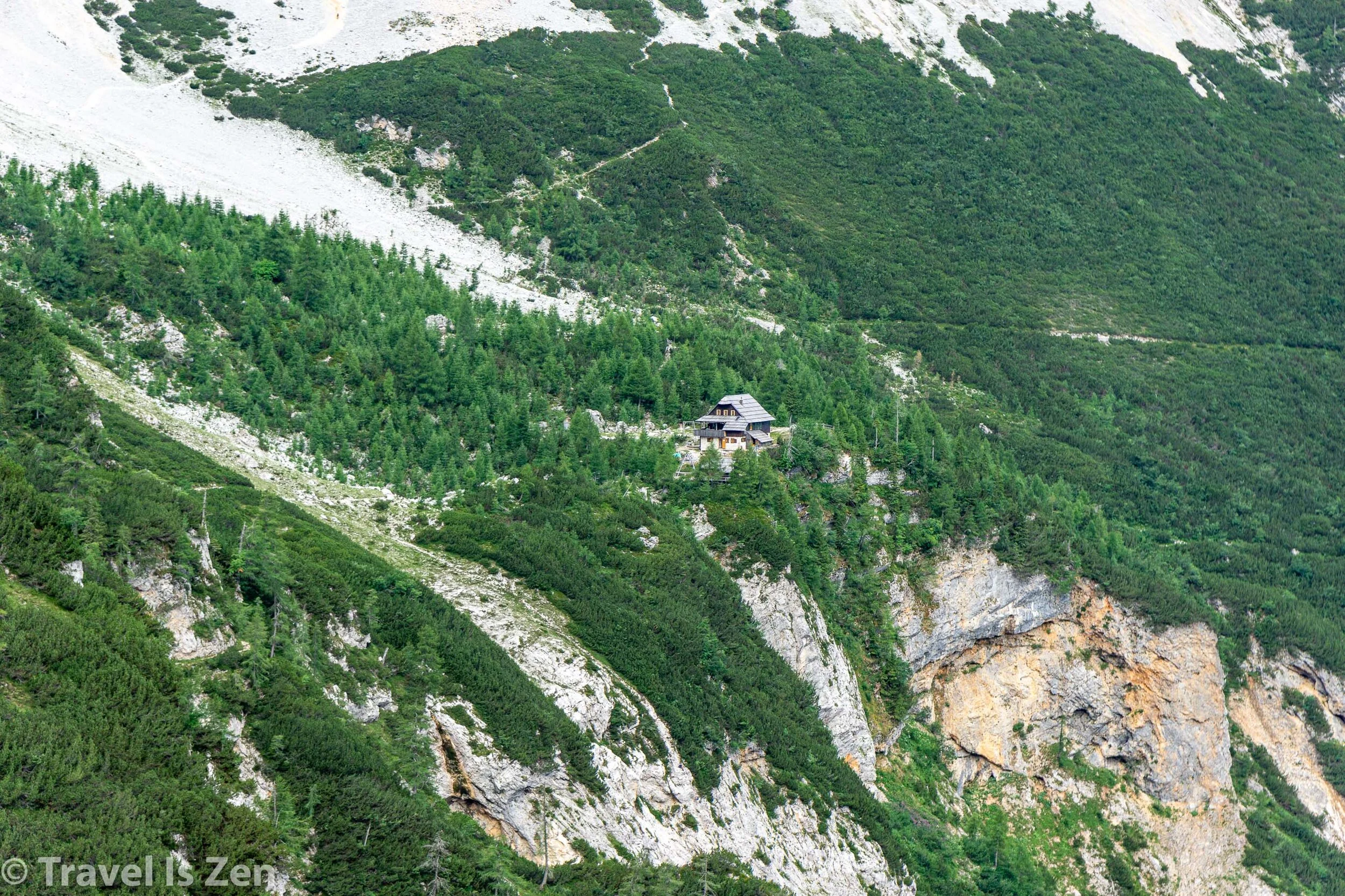 Ceška Koča is just a mile from Kranjska koča, perched on a similarly high ridge across a gorge. There are two ways to get there from Kranjska koča. If you are confident in your mountaineering skills and pack weight, you can use the via ferrata along the Slovenian trail. Alternatively, you can hike down to the valley and take an easier route through the pine forest.