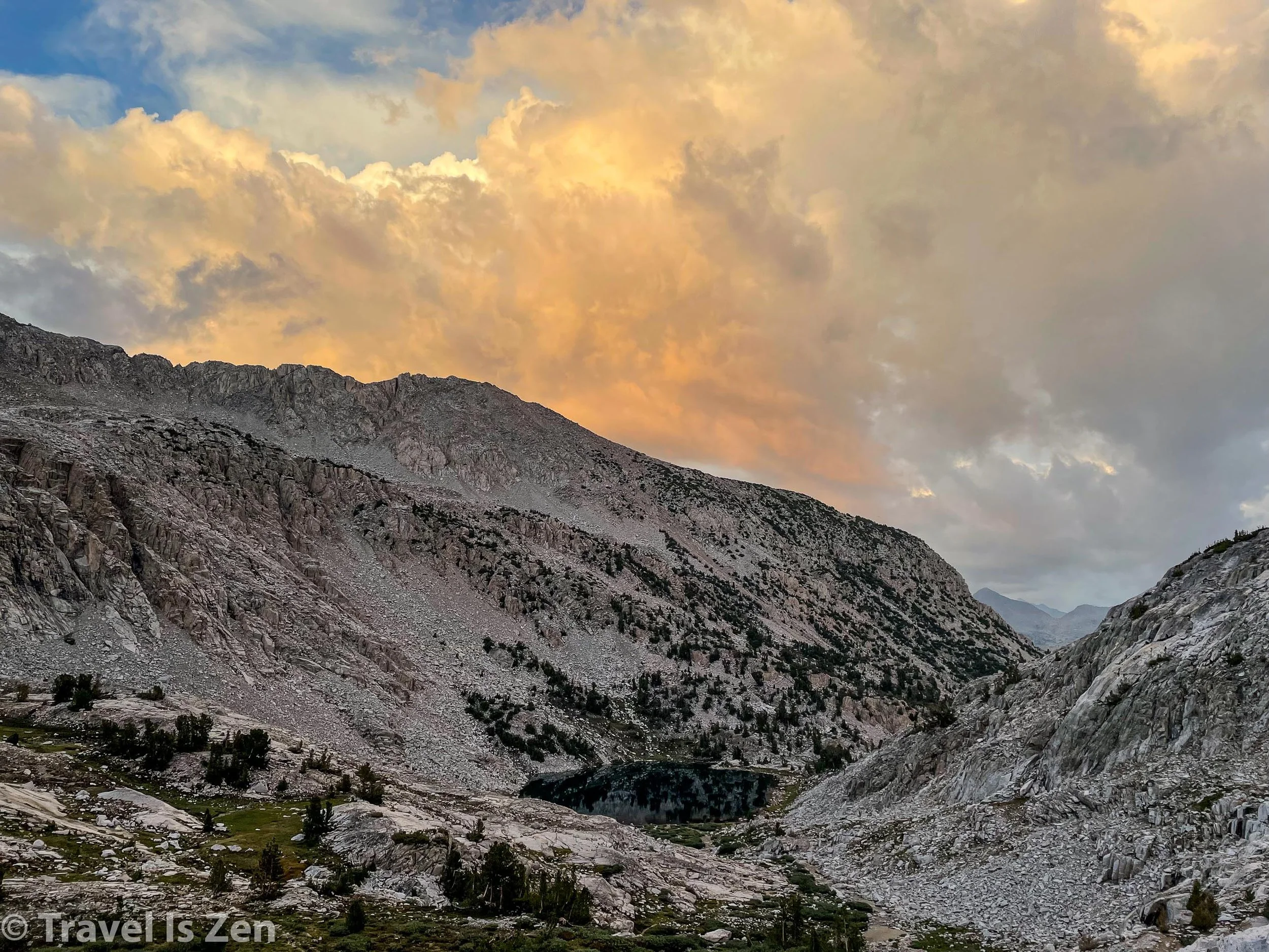 We did not stop for lunch, as we could see the clouds growing larger and darker as we neared the pass. We snapped our vanity photos at Muir Pass around 2:00 p.m., but we didn’t linger long. A seriously black cloud grew increasingly angrier as we headed down towards Helen Lake.