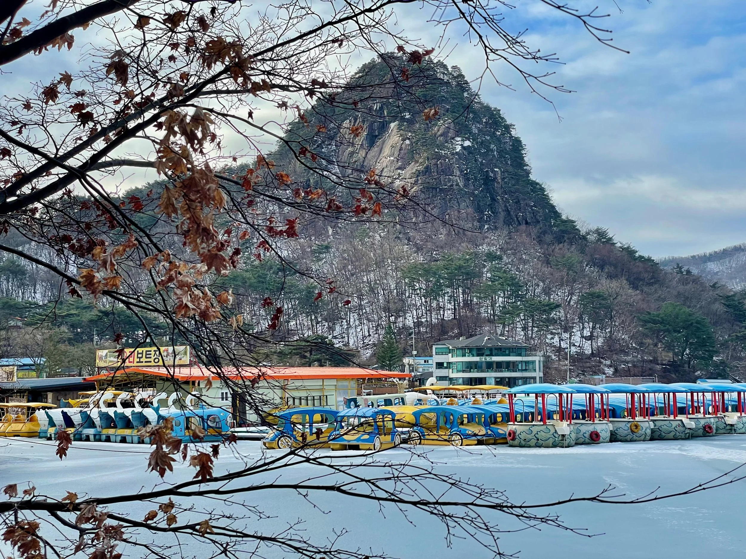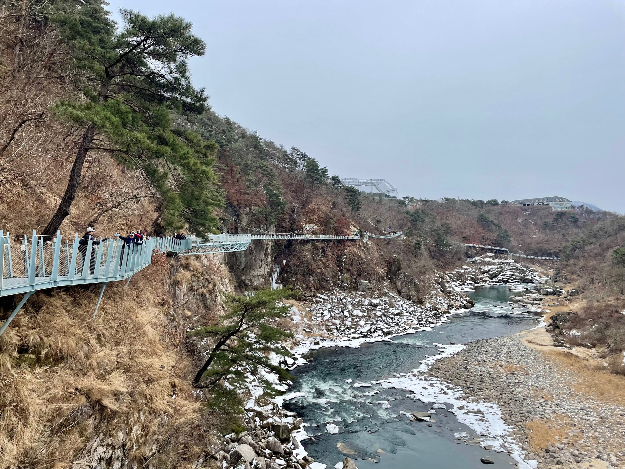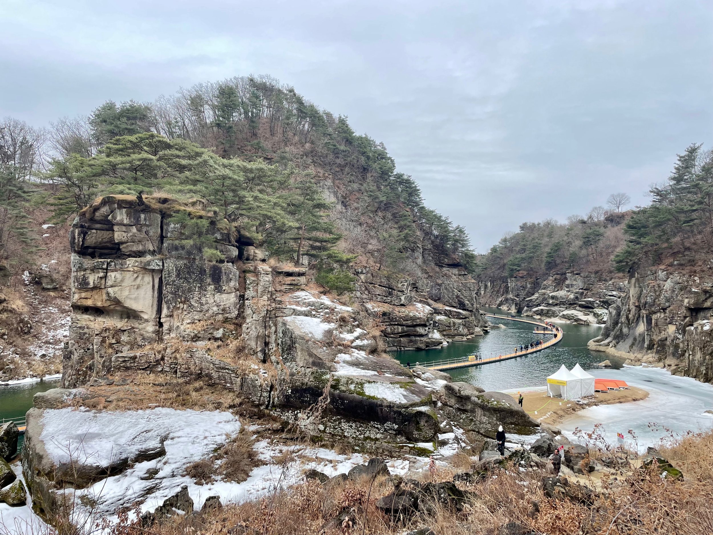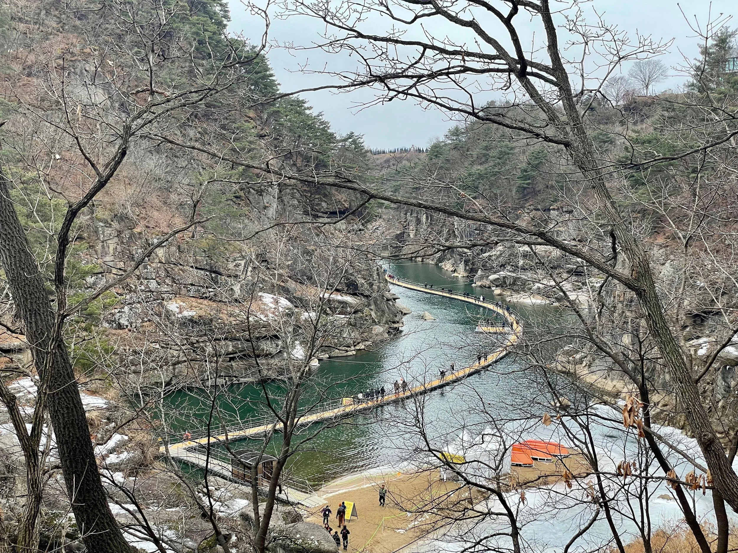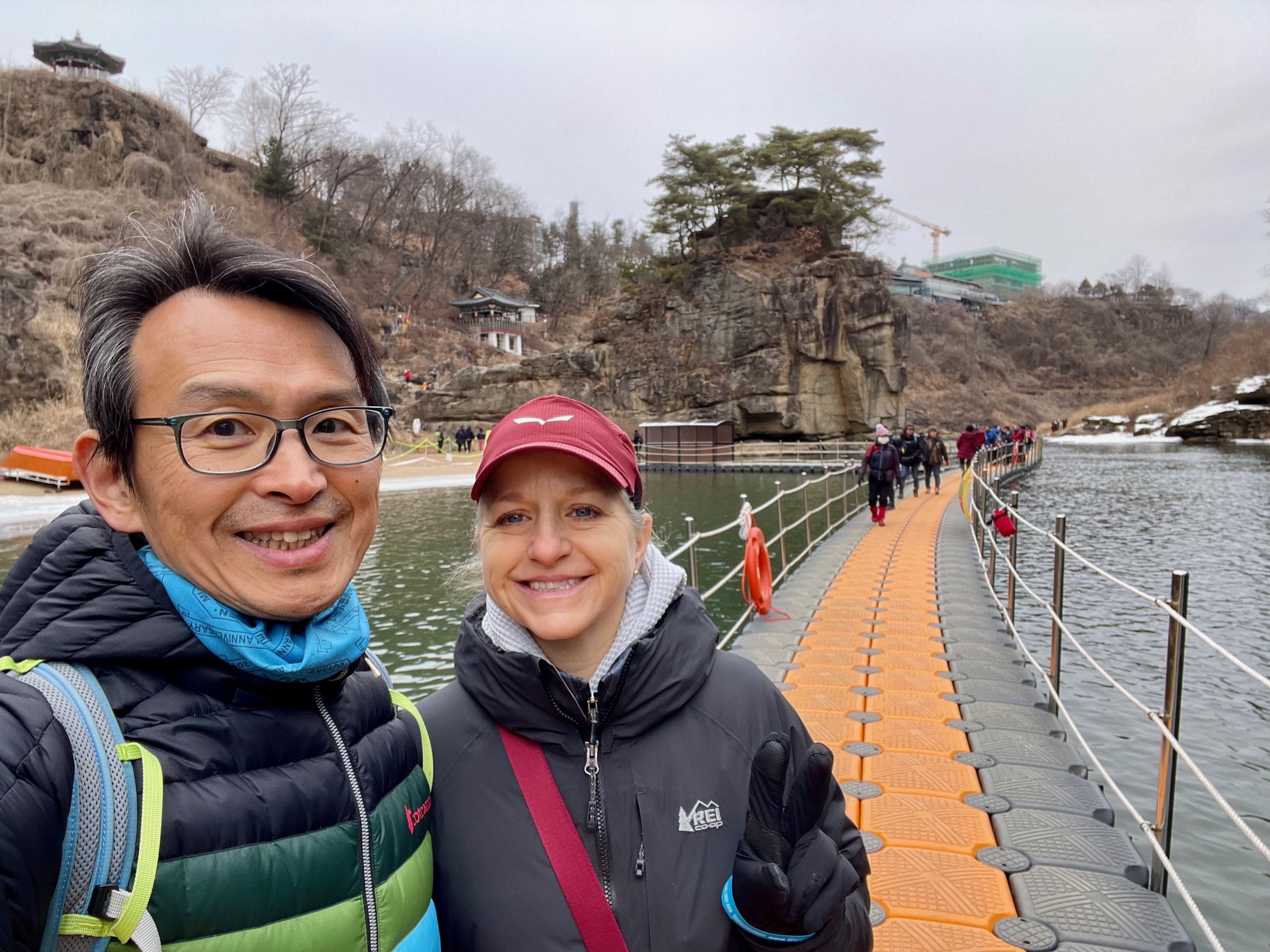 As an initial get-away from the Seoul, we did a road trip with Korean family to Pocheon (포천) to walk the “river and cliff trail” and see the unique volcanic-era geological formations and mineral springs. It was festive and fun — and cold!