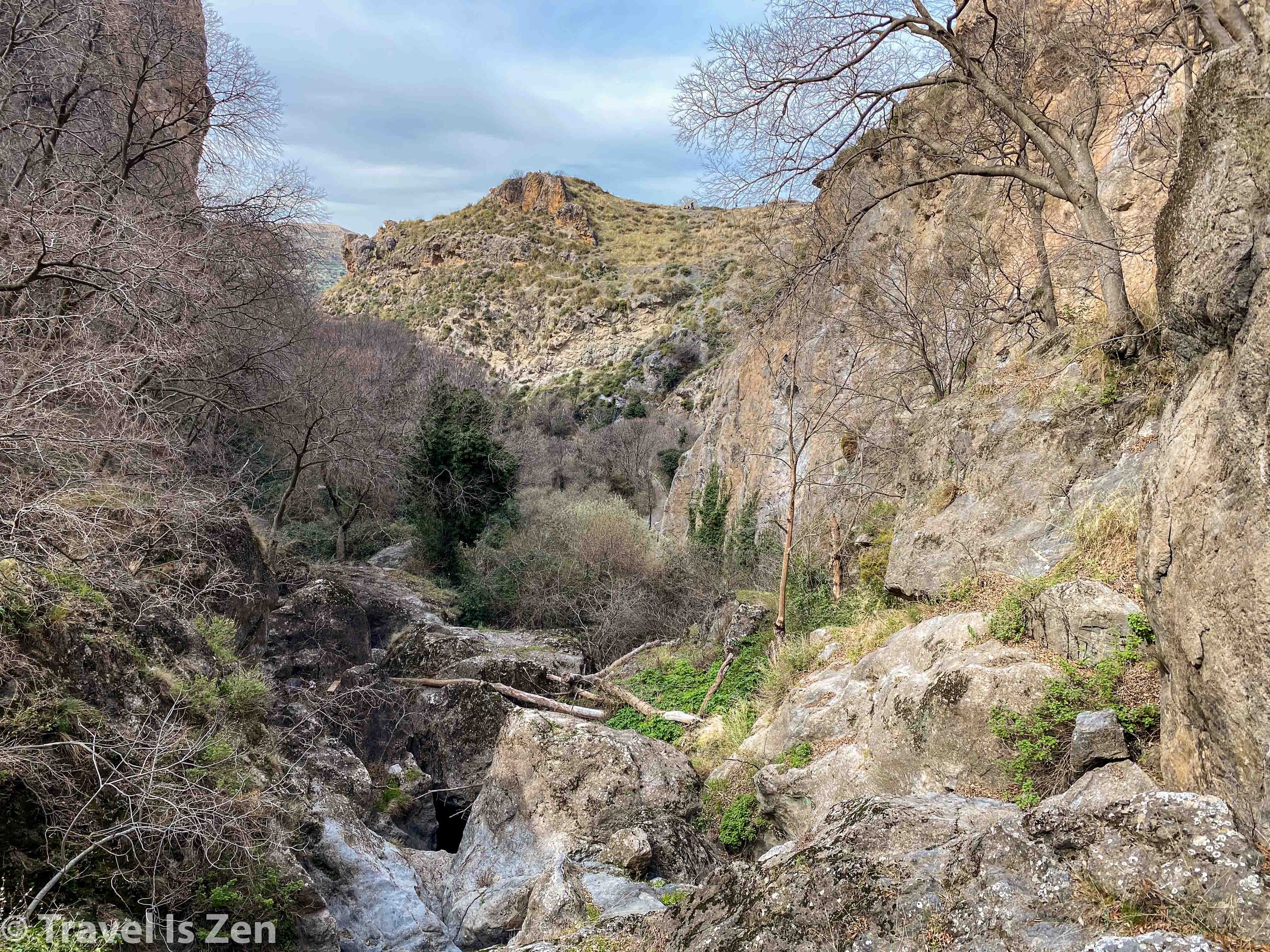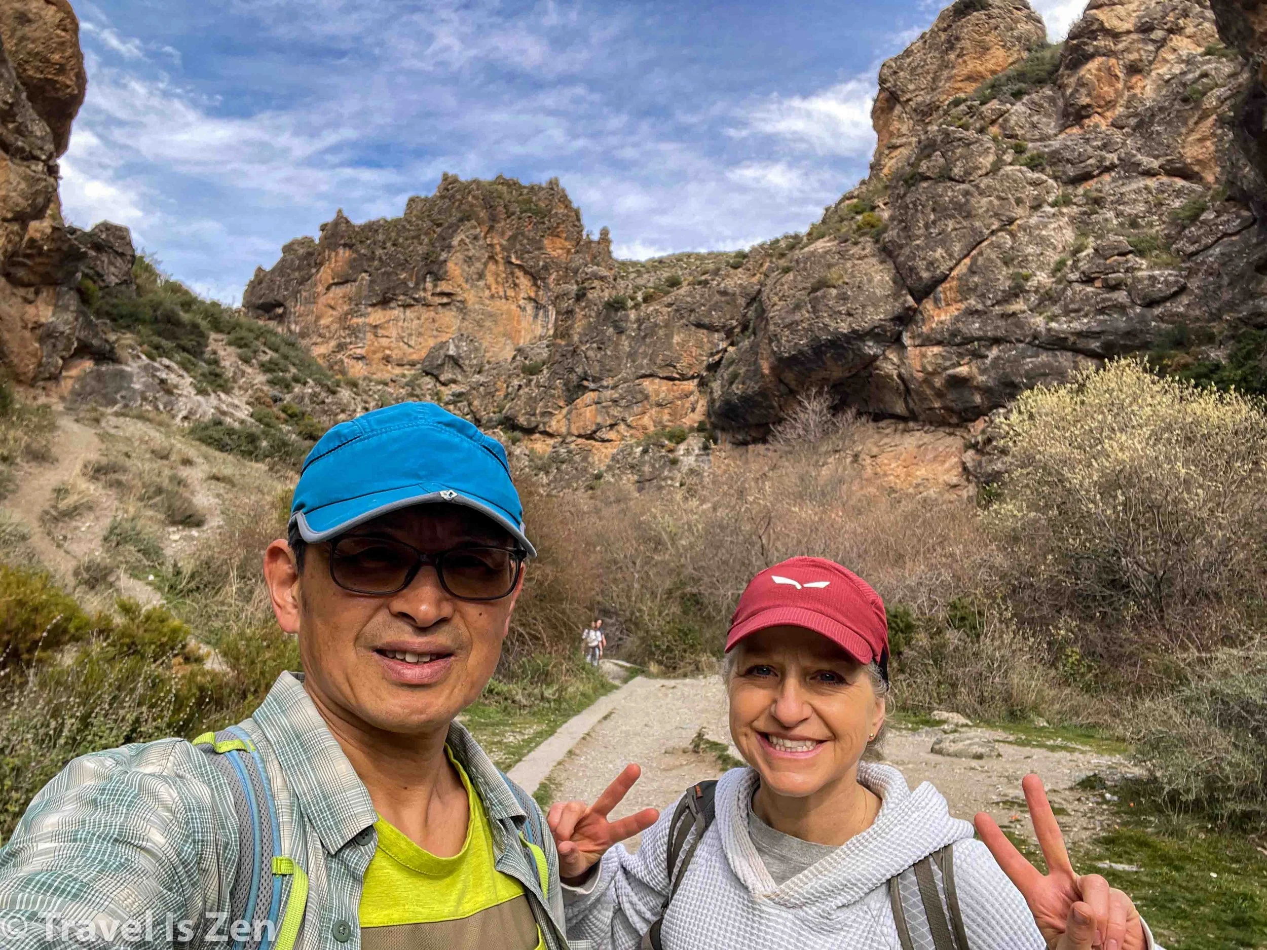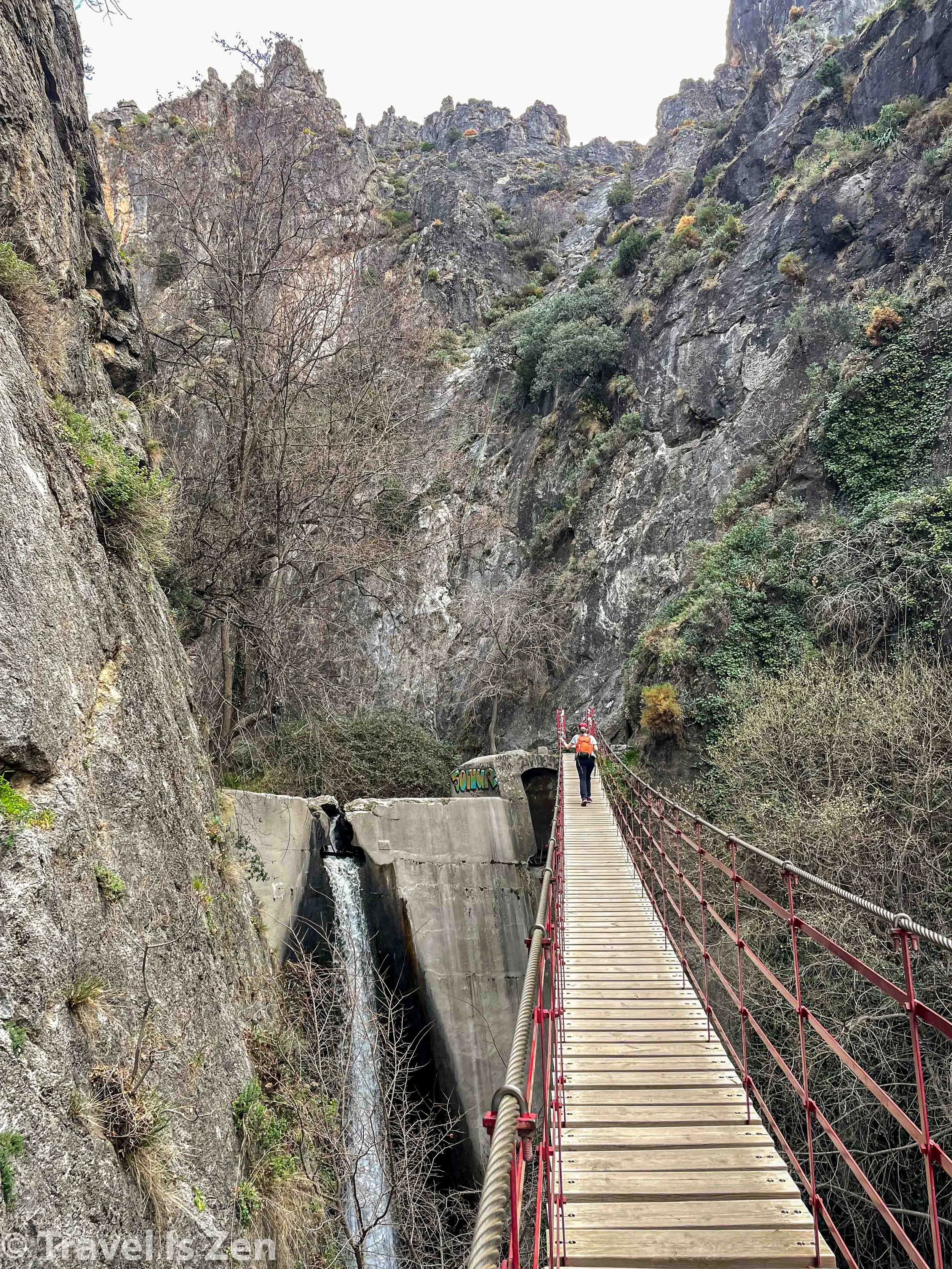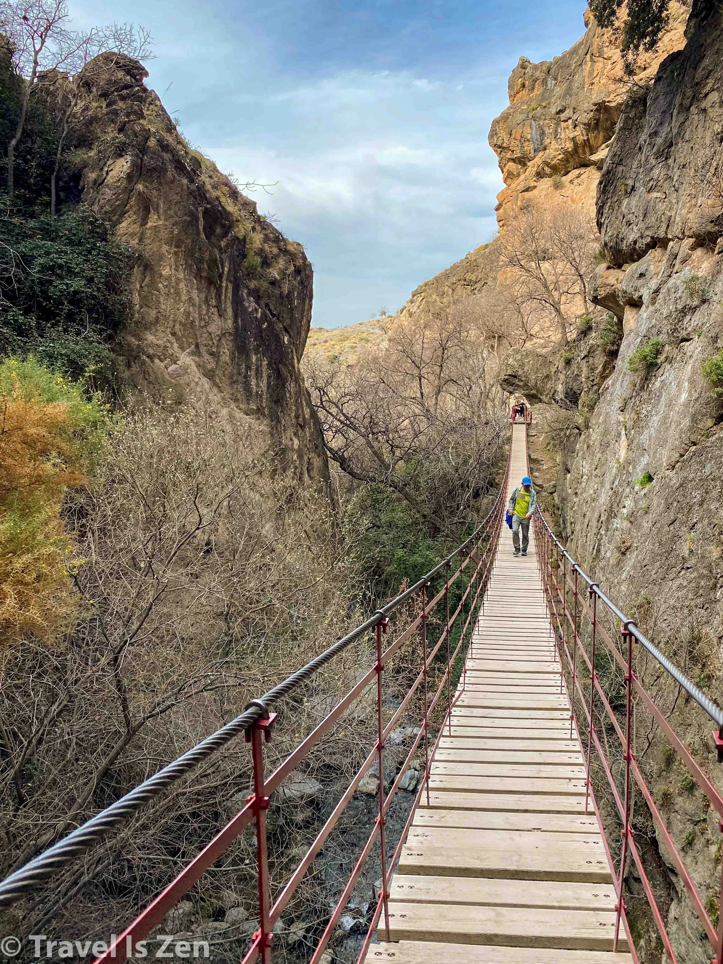 The next morning, we headed uphill and upstream to hike the trails in and around Los Cahorros gorge in Sierra Nevada National Park. The loop trail ambles along the limestone canyon up into the dusty foothills, criss-crossing the river over swinging bridges and dipping down riverside below sheer granite and limestone cliff walls popular with climbers.
