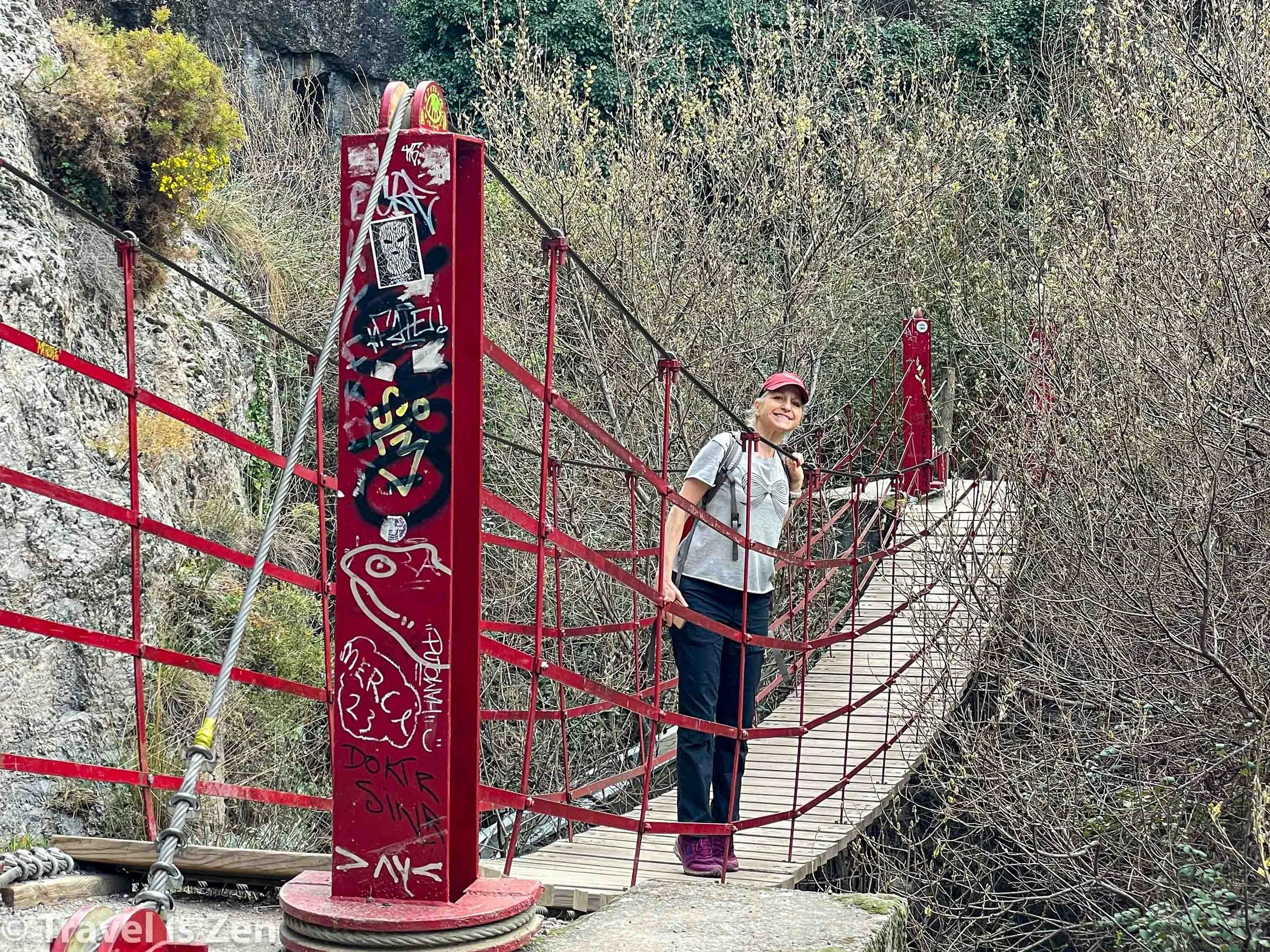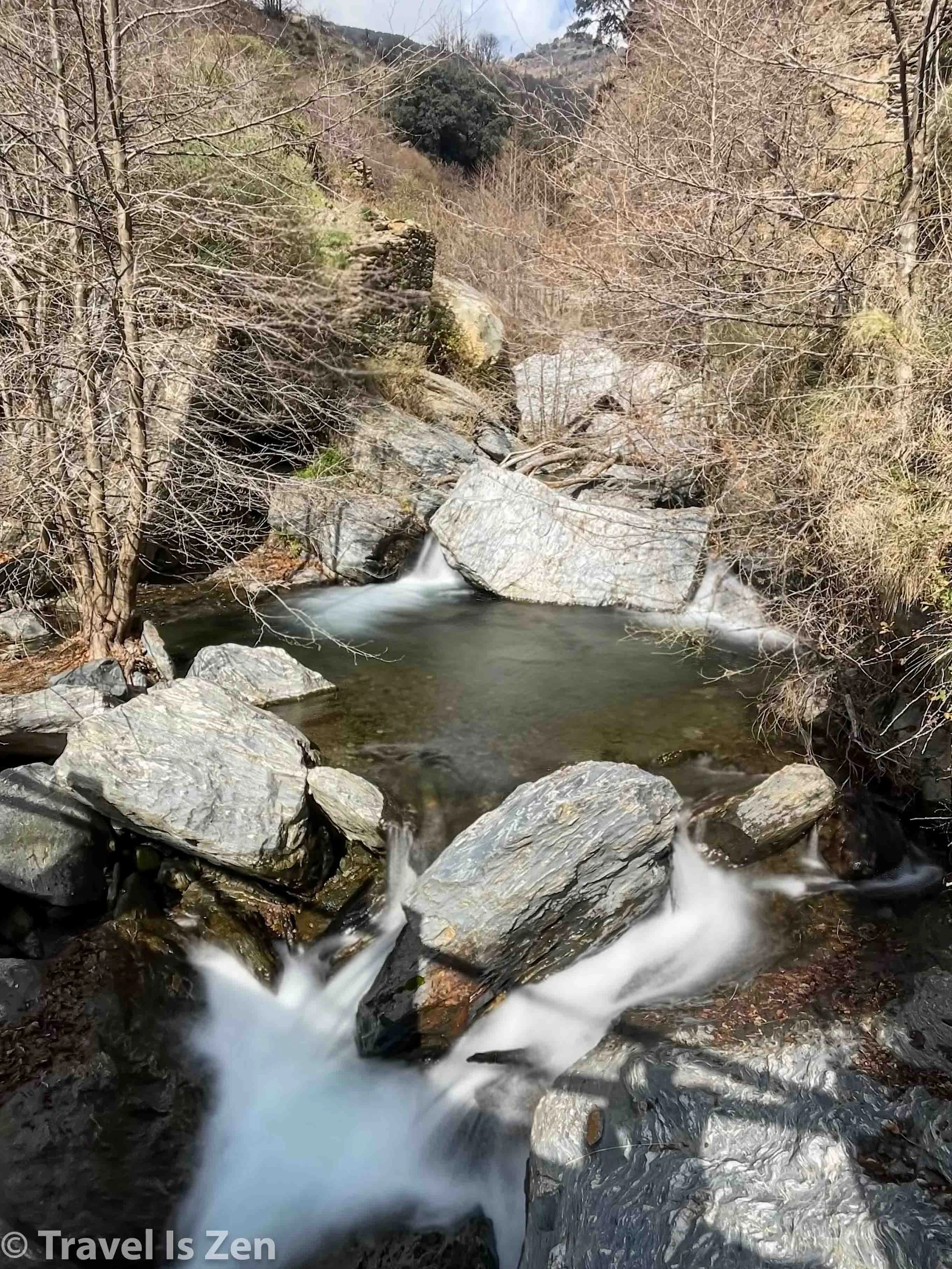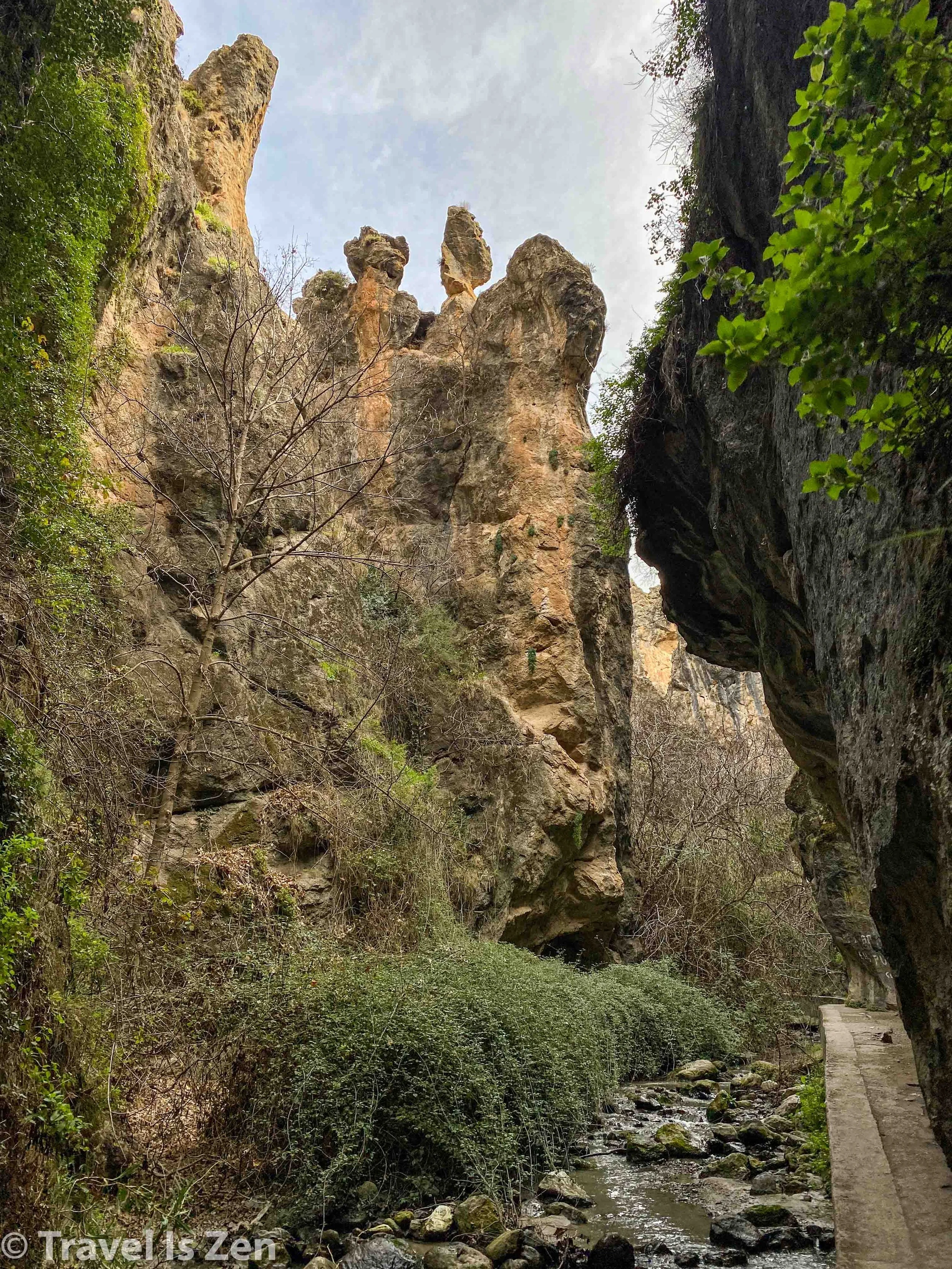 The next morning, we headed uphill and upstream to hike the trails in and around Los Cahorros gorge in Sierra Nevada National Park. The loop trail ambles along the limestone canyon up into the dusty foothills, criss-crossing the river over swinging bridges and dipping down riverside below sheer granite and limestone cliff walls popular with climbers.