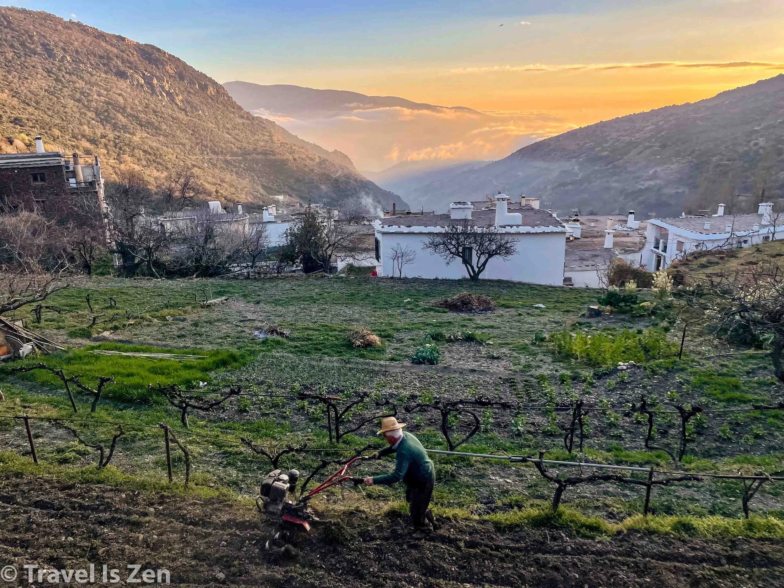 We were, of course, here to hike. After a restful evening, we headed out early to explore the trails. We chose a loop trail from Bubion that gradually proceeded down into the valley, crossed a small stream over a solid foot bridge, and ascended the opposite side of the ravine. Although still technically winter, the smell of chives, freshly-tilled earth, and early apple blossoms were signs of an emerging Spring. The sun was high, the air was silent, and we paused to enjoy a short nap on a sunny patio of a long abandoned residence; directly across the ravine perched Bubion.